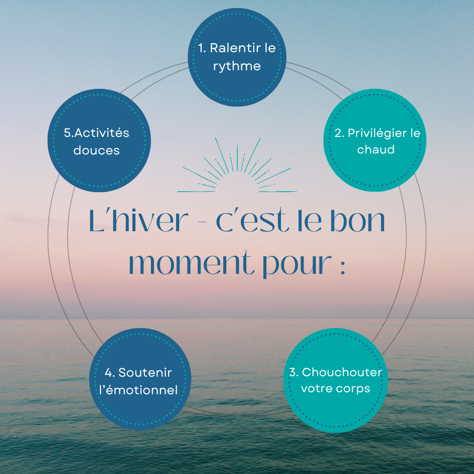 En MTC, l'hiver ne commence pas avec le calendrier officiel, mais avec le mouvement énergétique de la nature. La saison d'hiver débute ainsi autour du 7 novembre et se prolonge jusqu'au 20 janvier. Les dates sont décalées par rapport à la météo : on se base moins sur la température extérieure que sur le changement de dynamique interne...